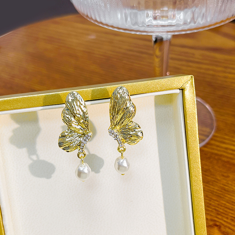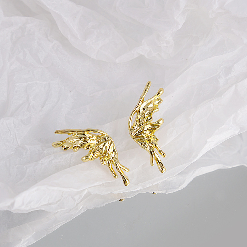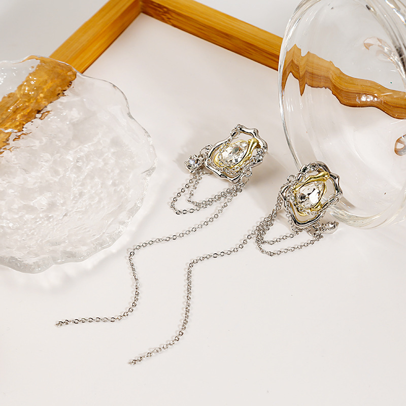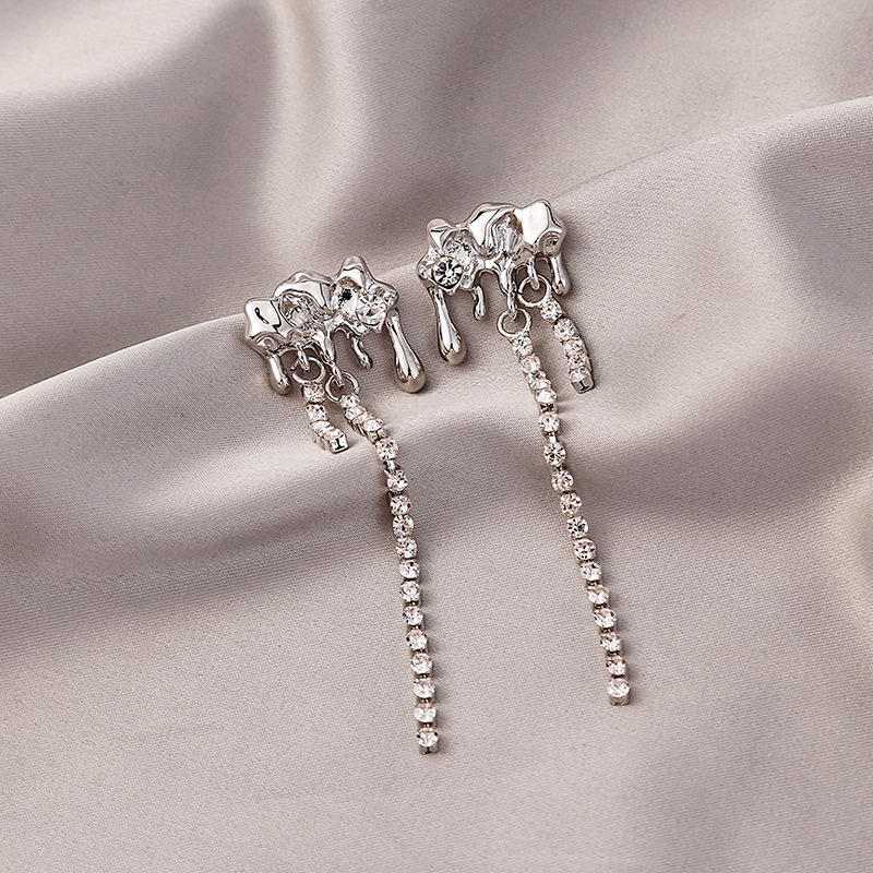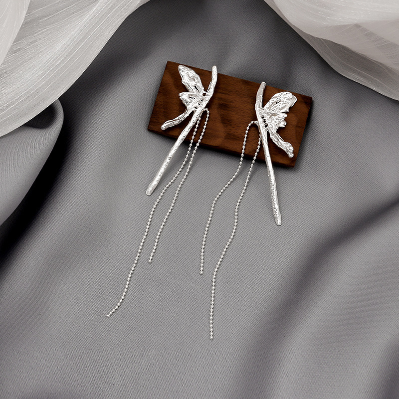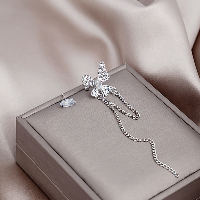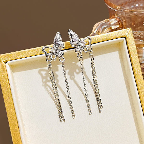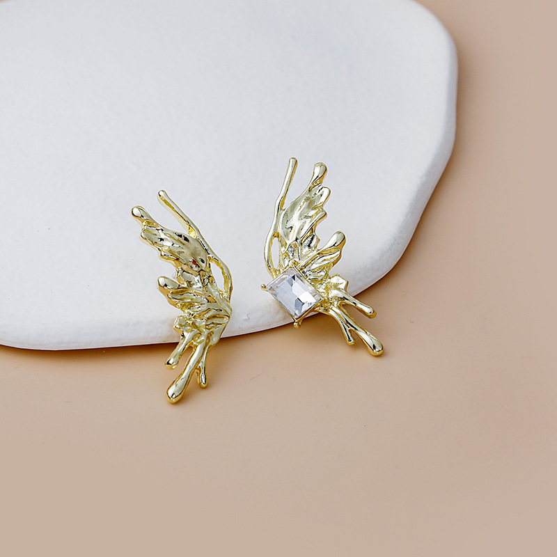 Pendientes largos asimétricos con diamantes brillantes y mariposas de metal líquido irregular